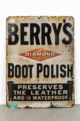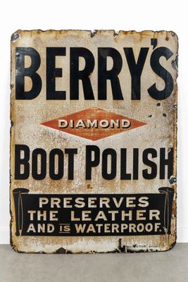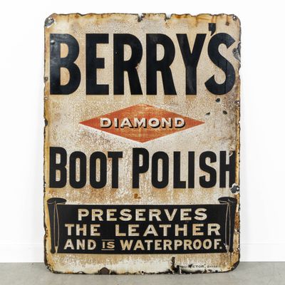 Enseigne publicitaire vintage en émail, "Berry's Boot Polish…