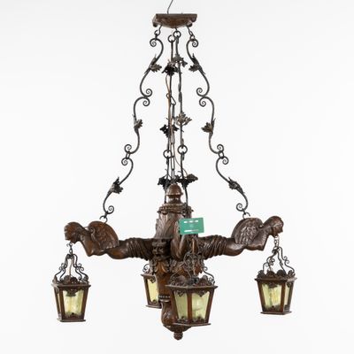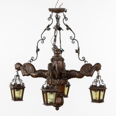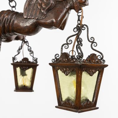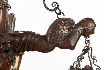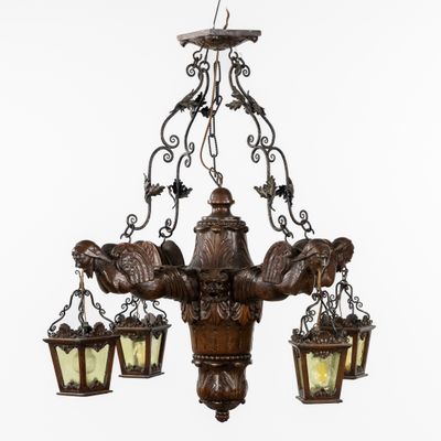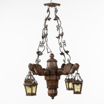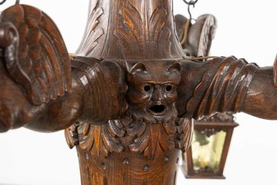 Grand lustre en bois sculpté avec des gargouilles et des lan…