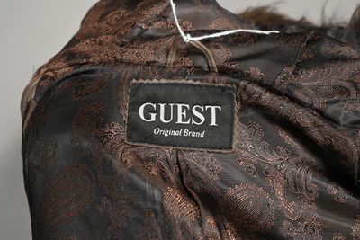 GUEST. Veste en cuir taupe à capuche gansée de fourure, ferm…