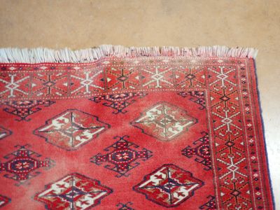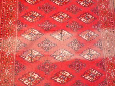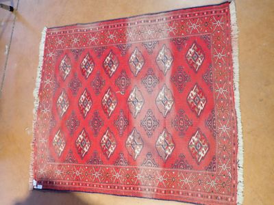 Tapis noué main, couleur dominante rouge, décor de losanges,…
