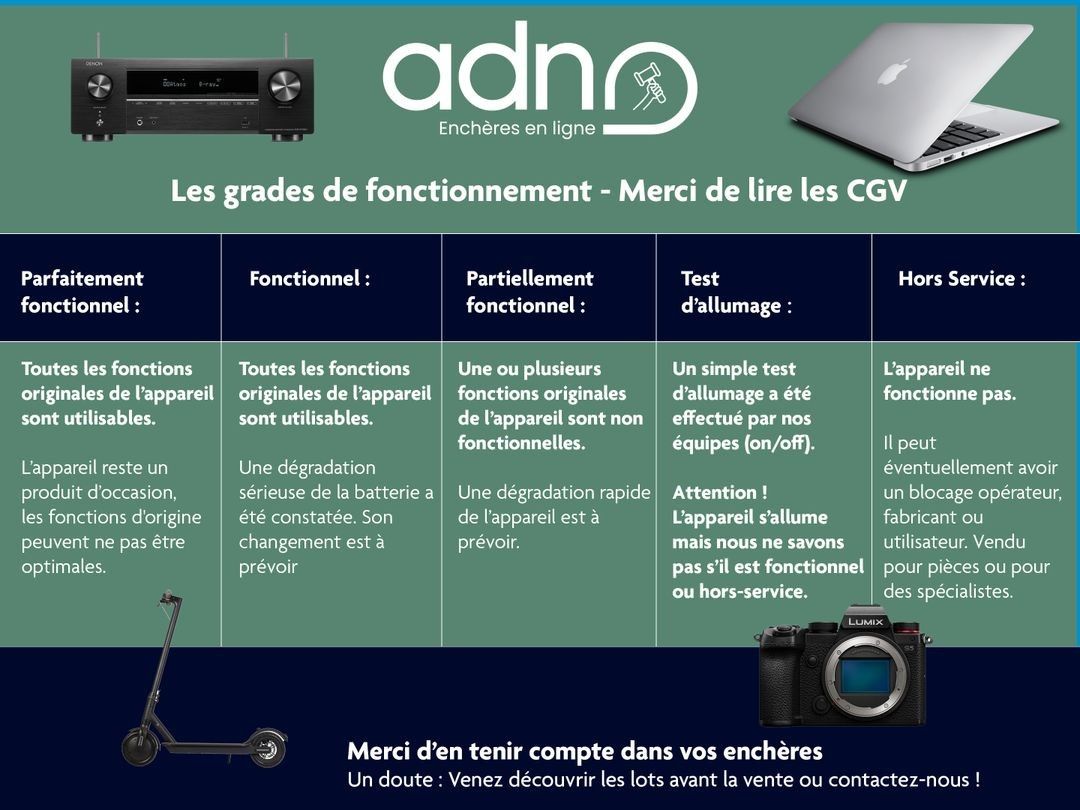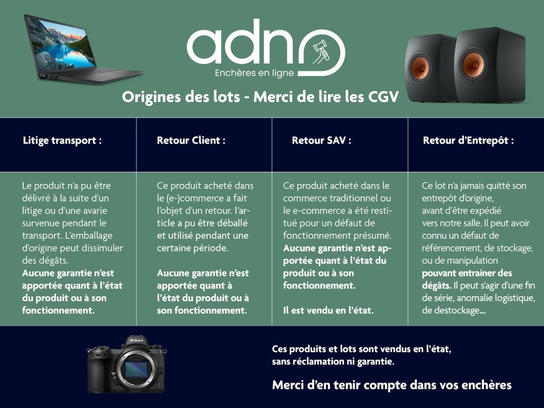 Ce lot appartient à la catégorie Destockage & Invendus. Présenté par ADN Enchères LYON - Toutes Les Enchères à Décines-Charpieu. 5 photos disponibles.
