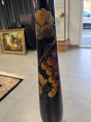 Lampadaire bois tourné noirci à décor de pampres de vigne av…