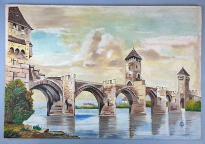 Ecole Française XX° Le pont Valentré à Cahors Huile sur toil…