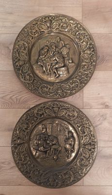 3 bas reliefs en cuivre à décors repoussés de scènes de tave…