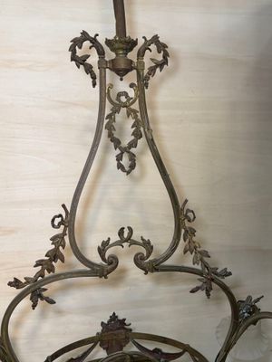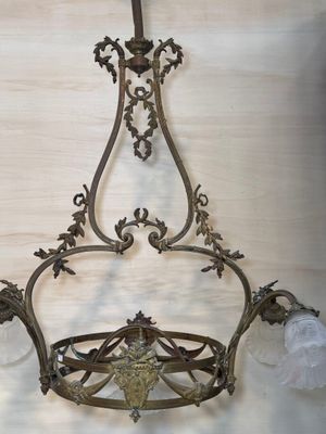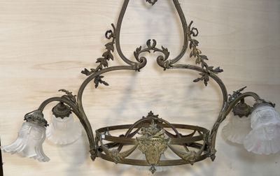 Importante suspension en laiton à cinq tulipes en verre moul…