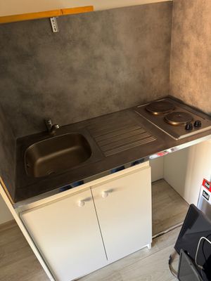 V65: Meuble évier avec plaque 2 feux électriques + hotte