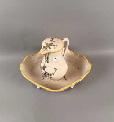 Broc couvert et son bassin à décor de roses au manganèse.