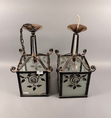Paire de lanternes en fer forgé à décor floral stylisé.