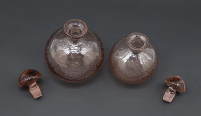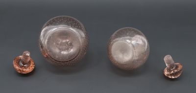 Lot de deux flacons ronds en verre teinté rosé à décor bullé…