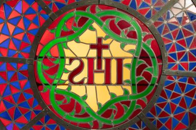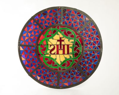 Rosace en vitrail, verres et plomb, motif central IHS sommé …