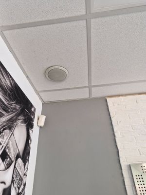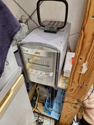 Lecteur CD JVC et ses deux enceintes au plafond dans le salo…