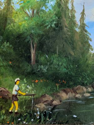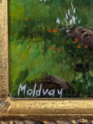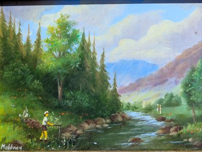 Huile sur panneau, La pêche en rivière, sbg Moldvay - Dim.