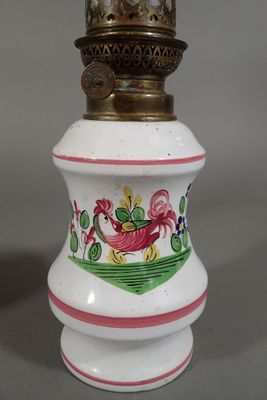 Deux lampes à pétrole, une en faïence de l'Est à décor de co…