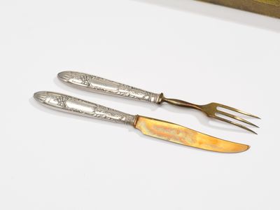 DOUZE COUVERTS À GÂTEAU 12 fourchettes et 12 couteaux, en ar…