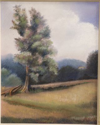 Ecole du XXème siècle. Arbre dans un champ. Pastel, monogram…