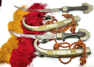 Paire de poignards, lames courbées, manches en bois, fourrea…