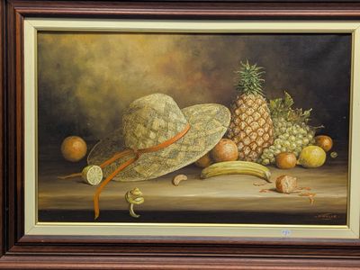 Noëlle ZECCHINON (XXe). Nature morte aux fruits et au chapea…