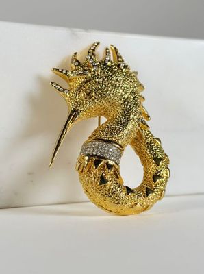 GIANFRANCO FERRÉ, broche hippocampe, métal doré et strass.