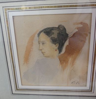 Aquarelle représentant une tête de Femme monogrammée E.G.