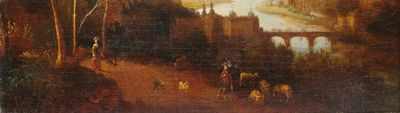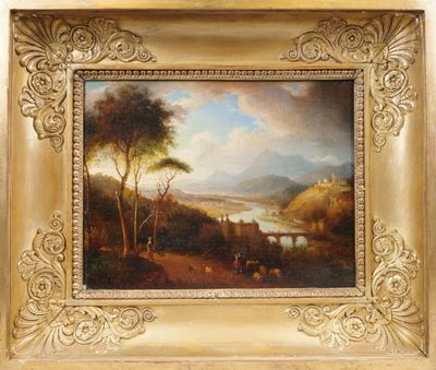 Ecole du nord du XIXème siècle. Paysage animé au pont