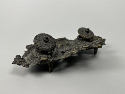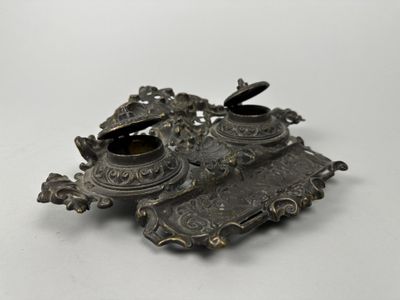 Encrier à deux godets en bronze à patine brune à riche décor…