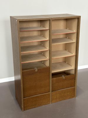 Classeur double à rideaux en aggloméré mélaminé façon chêne.
