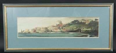 Adam SAULNIER: "Village en bord de mer", huile sur papier, s…