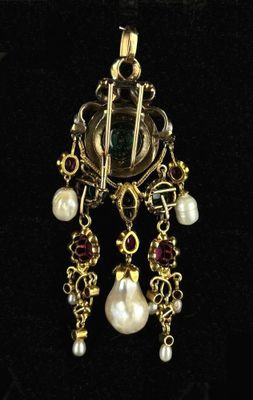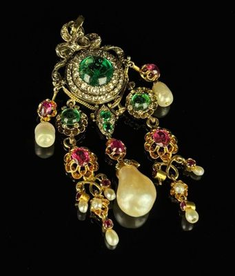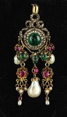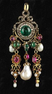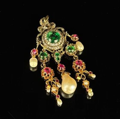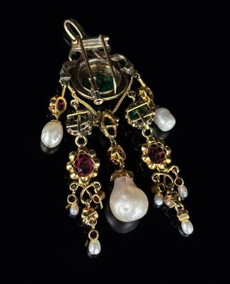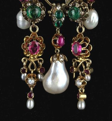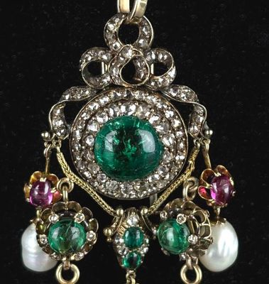 Elle est fabriquée en or et en argent, ornée de cabochons d'émeraudes de haute qualité.