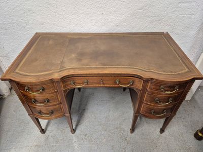 Ce bureau de style anglais, élégant et fonctionnel, est en placage de bois de qualité. Avec ses deux caissons, il offre un espace de rangement pratique tout en ajoutant une touche d'authenticité à votre intérieur. Ce meuble, typique des années 20-30, se distingue par son design raffiné et ses finitions soignées. Parfait pour un bureau à domicile ou un espace de travail, il allie esthétisme et praticité.