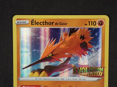 Découvrez cette carte rare d'Electhor de Galar, un ajout précieux pour tout collectionneur de cartes Pokémon. Émise dans le cadre de la série Sword & Shield, cette carte se distingue par son illustration dynamique et ses caractéristiques uniques. Les cartes rares comme celle-ci sont très recherchées, surtout parmi les fans de la région de Galar. En raison de sa popularité croissante, cette carte pourrait voir sa valeur augmenter dans les années à venir.
