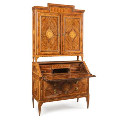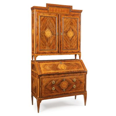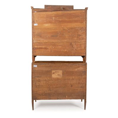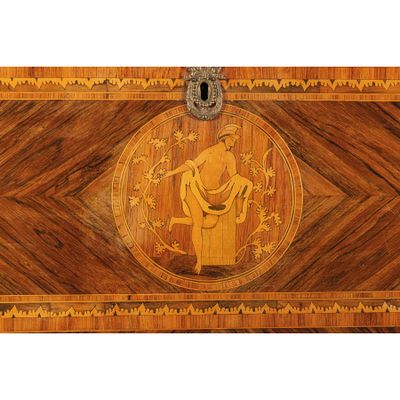 Cette commode à abattant est un exemple raffiné de l'artisanat en bois, mettant en avant un placage de divers bois qui lui confère une esthétique unique. Conçue avec une contremarche délicate, elle allie fonctionnalité et style, parfaite pour un intérieur classique ou contemporain. Les dimensions précises de cette pièce ne sont pas spécifiées, mais son design compact la rend idéale pour les espaces restreints. En bon état général, elle présente un potentiel décoratif et pratique indéniable, attirant les amateurs de mobilier vintage.