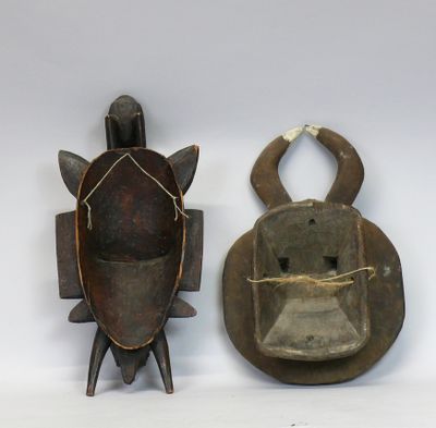 Deux masques en bois à patine sombre, l’un zooanthropomorphe…