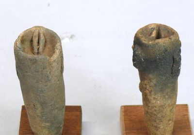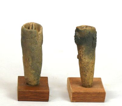 Deux têtes en terre cuite rosée au cou en pointe, aux larges…