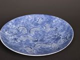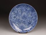 Quel est le prix d'occasion de « Grand plat en porcelaine bleu poudré à décor de deux dragons… » ?