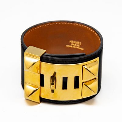 Invendus HERMES Paris Bracelet manchette en cuir et métal doré modèle… Description Son estimation se situe entre 400 et 600 €. Présenté par NORMANDY AUCTION à Rouen. 2 photos disponibles.