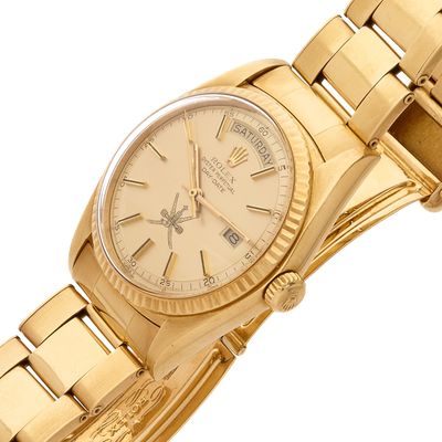 Invendus ROLEX Day-Date “Khanjar Sultanat d'Oman” Description Son estimation se situe entre 20 000 et 40 000 €. Présenté par AGUTTES à Neuilly-Sur-Seine. 3 photos disponibles.
