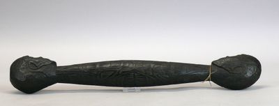 Sceptre en bois dur et lourd à patine sombre sculpté de deux…