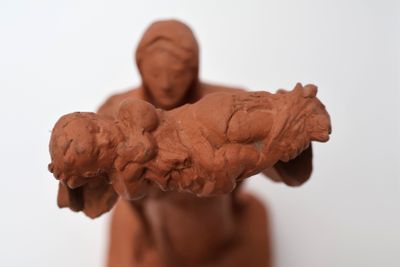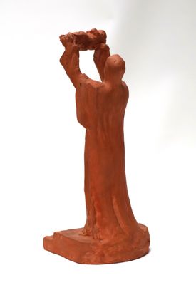 Sujet en terre-cuite figurant une femme drapée présentant un…