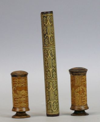 Trois contenants en bambou et bois aux fins décors mythologi…