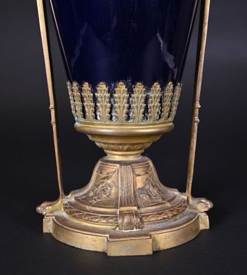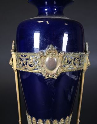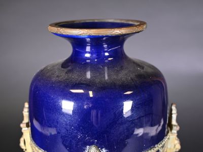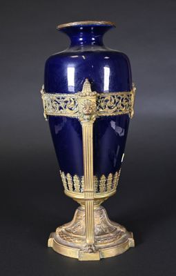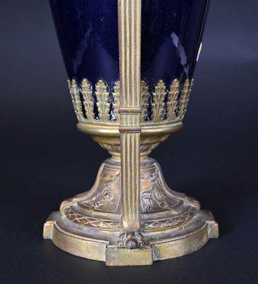 Le vase est en porcelaine bleue, avec une monture en bronze ciselé.