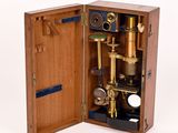 Microscope en bronze et laiton dans son coffret en acajou