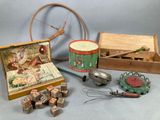 Réunion de jouets anciens: tambour en tôle lithographiée CREATION Ets