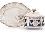 Fruit du travail des « artisans de l'or », découvrez la vaisselle et les objets en métaux précieux proposés à travers toute la France, que vous cherchiez des objets en argent, en métal argenté, en vermeil... De la chocolatière du XVIIIe siècle à la ménagère Christofle ou Puiforcat, vous trouverez tout l'univers de l'argenterie aux enchères : service à thé ou café, pot à lait, verseuse, légumier, plat rond et ovale, sucrier, huilier vinaigrier, salière, saucière, coupelle, taste-vin, gobelet, timbale, écuelle, couteaux, pelles, suite de couverts de table, cuillères, ornés de poinçons d'orfèvres, de jurandes, de titres : tête de minerve ou d'aigle, poinçons de charge et de décharge... Ecrin à couverts sont également vendus lors des vacations de même que paires de flambeaux, bougeoirs, samovars, pièces en cristal ornées de montures en argent... De petits objets luxueux tels les étuis à cigarettes et tabatières complètent ces ensembles. Enfin, des objets d'art sacré peuvent être dispersés : crucifix, calice, ostensoir...