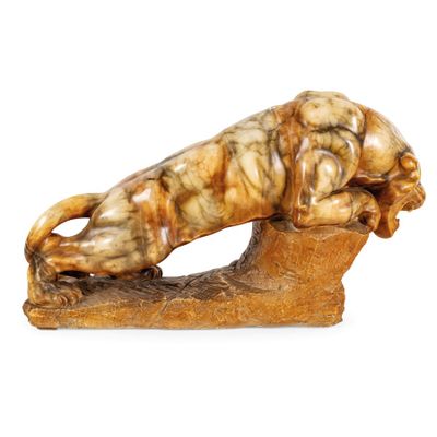 Cette sculpture en albâtre, attribuée à Angiolo Vannetti (1881-1962), représente une majestueuse panthère, symbole de puissance et de grâce. Mesurant environ 30 cm de long, cette œuvre témoigne du talent exceptionnel de l'artiste, connu pour ses sculptures animalières. L'albâtre, avec sa texture douce et ses nuances délicates, confère à cette pièce une élégance intemporelle. Bien que l'état précis ne soit pas mentionné, les sculptures de Vannetti sont recherchées par les collectionneurs, ce qui en fait un objet de valeur sur le marché de l'art.